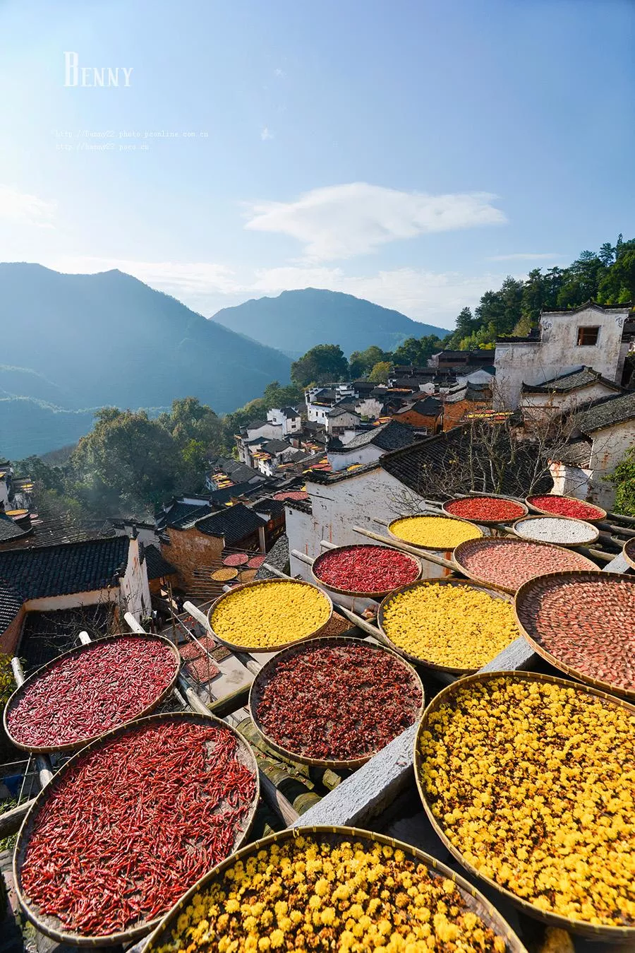 立秋后,走进江西婺源县篁岭古村,只见整个山间,饱经沧桑的徽式民居土砖外墙与晒架上、圆圆晒匾里,五彩缤纷的丰收果实组合。这是篁岭古村传承500多年的“晒秋”情景。