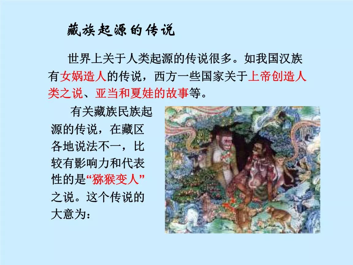关于藏族的起源,存在几种不同的说法。首先是卵生说。藏族本教文献记载,藏族祖先是由一个大卵孵化而来。卵初化出一个大肉团,此肉团虽无五识(眼、耳、鼻、舌、身),却有思维。他根据自己的愿望,幻化成为人的形体,叫做耶门杰波。他娶秋佳杰姆为妻,生子积足杰瓦。积足杰瓦娶妻东萨鄂姆,生子郭萨杰积。郭萨杰积有三个儿子,最小的儿子是天神世系的末代,也是人间世系的始祖。他与仓萨却玛结合逐渐繁衍出了人类[4]。