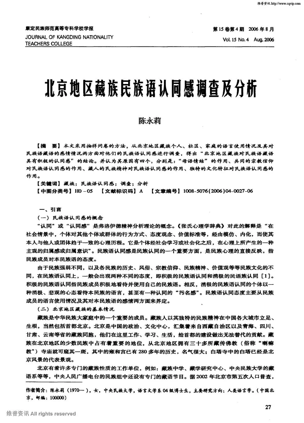 陈永莉在《康定民族师范高等专科学校学报》2006年第4期撰文,采用抽样问卷的方法,对北京地区藏族个人、社区、家庭的语言使用情况及其对民族语藏语的感情情况进行了调查。结果显示,北京地区的藏族人最熟悉的语言文字是藏语藏文的占到85%以上,他们在社区、家庭中基本使用民族语,在工作及其他场合也以民族语为首选的语言。据此,作者认为,北京地区藏族对藏语具有积极的认同感。