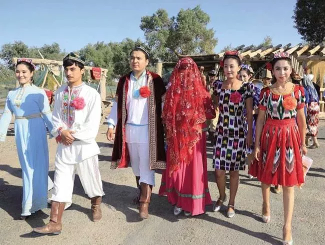 美丽的姑娘随着欢快的音乐翩翩起舞,帅气的新郎赶着马车迎娶心爱的新娘……21日,一场颇具特色的婚礼在尉犁县罗布人村寨景区激情上演。
