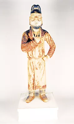 在新疆维吾尔自治区博物馆“新疆古代服饰展览”大厅,伫立着一尊身材高大的彩绘泥塑人物雕像。这尊雕像于1972年出土于吐鲁番地区阿斯塔那216号墓,反映了1000多年前唐代吐鲁番地区少数民族男子的形象。